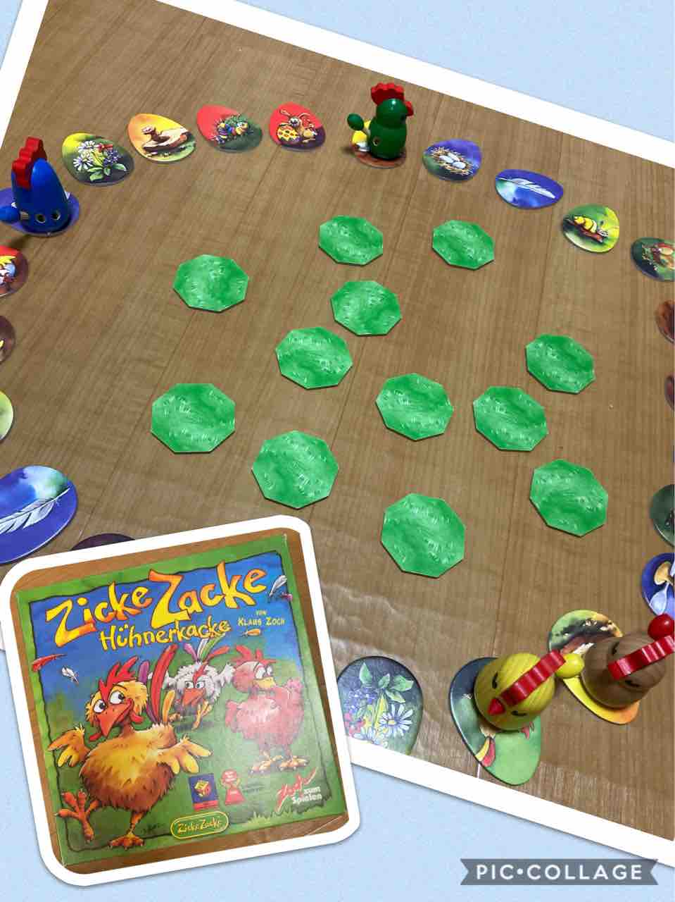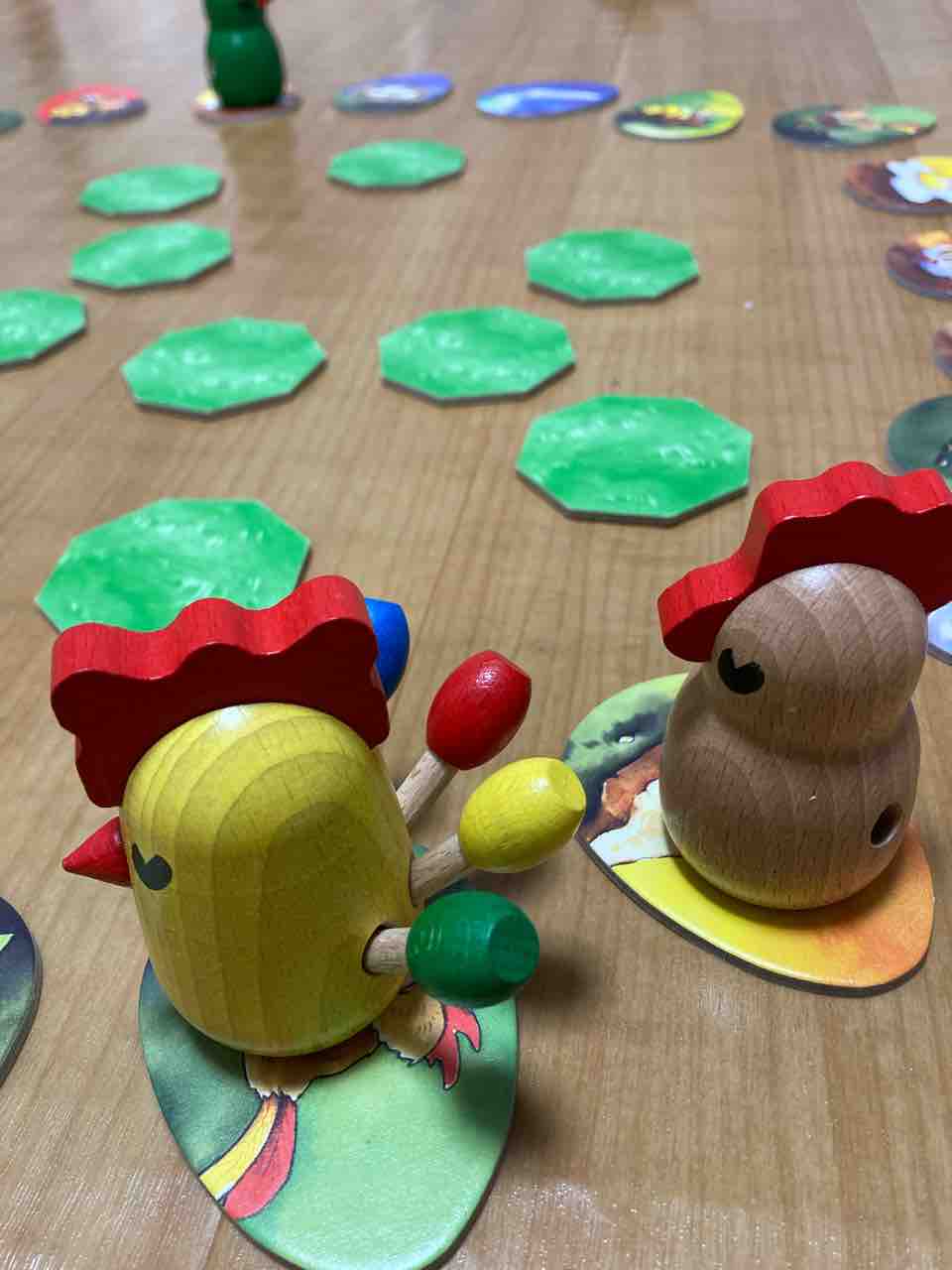 遊ぶ人数により、等間隔になるようににわとりを卵型タイルの上に置きます。にわとりの間が、2人の時は11枚、3人の時は7枚、4人の時は5枚空けます。