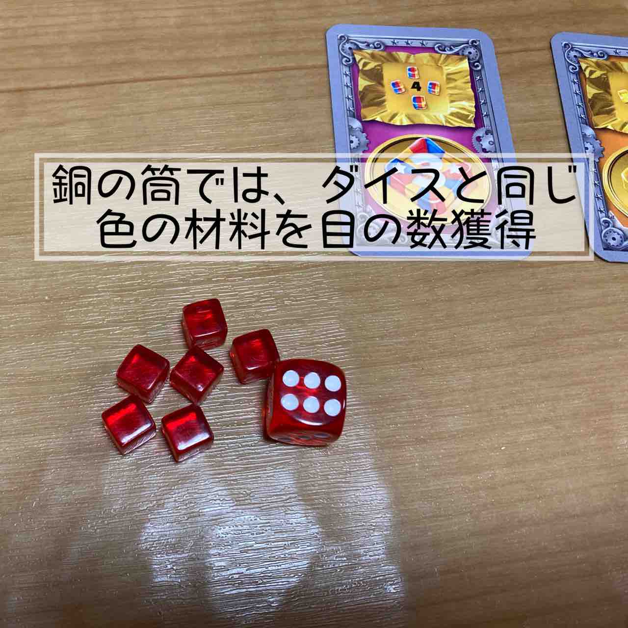 たとえば、銅の筒(材料獲得の筒)で、一番小さい青の6と大きな青の1があると、やっぱり青の材料6個欲しいので、小さいダイスを選んでしまうんです。