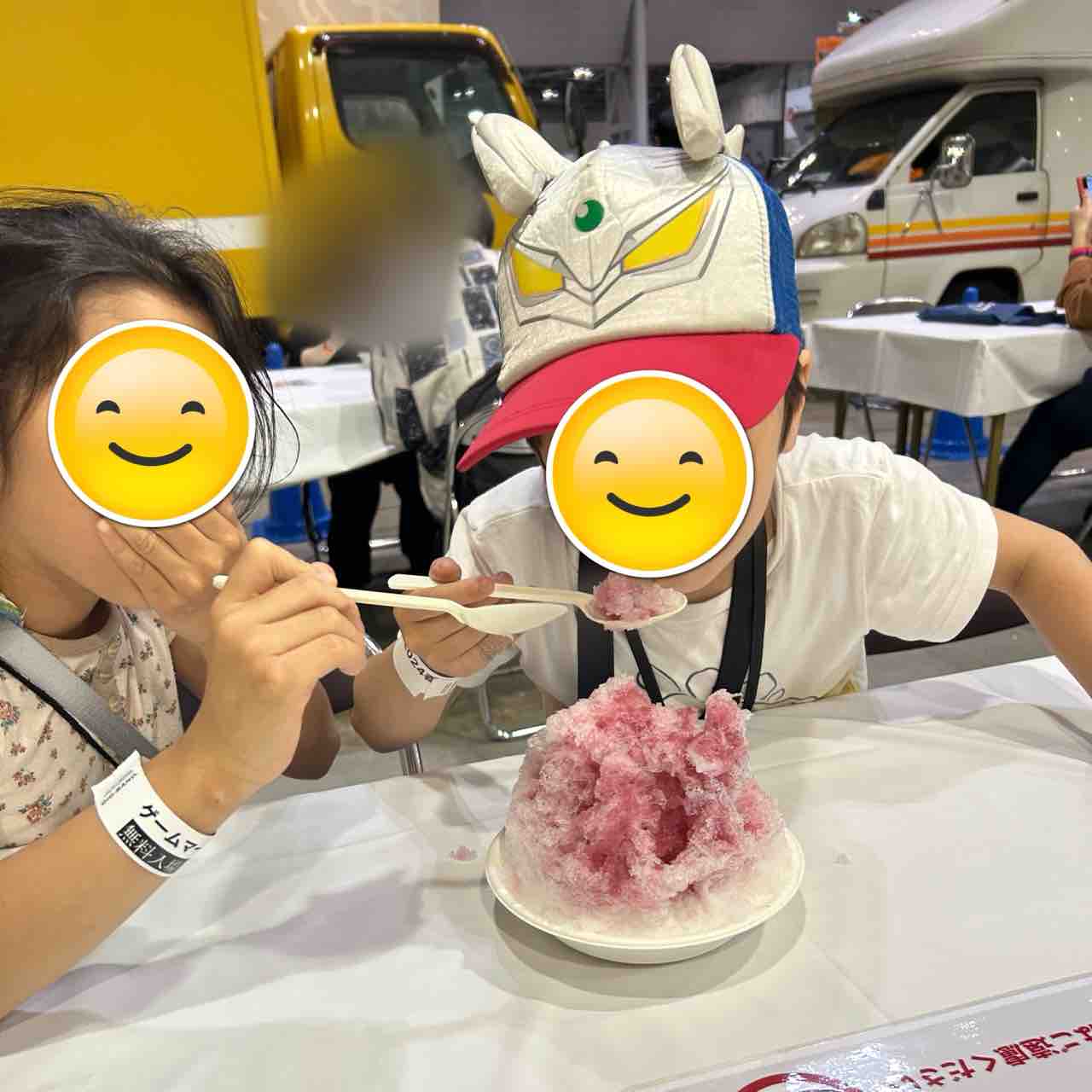 焼きそば、角煮バーガー、フランクフルトを食べて、お腹いっぱいになったと思ったのに、かき氷を見つけて、食べたいリクエストがきました。