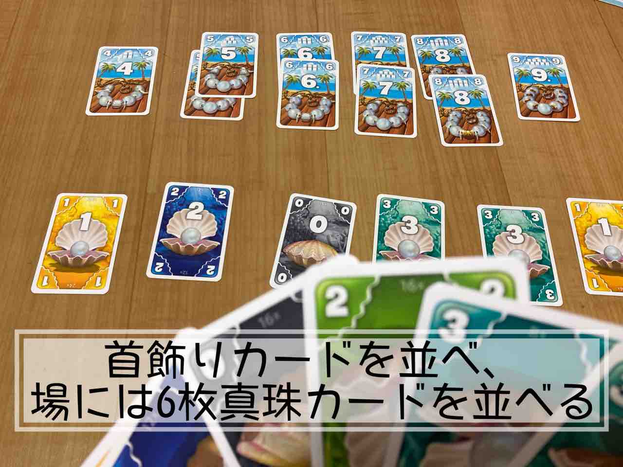 使う真珠カードをすべてをよく混ぜ、各プレイヤーに6枚ずつ配ります。