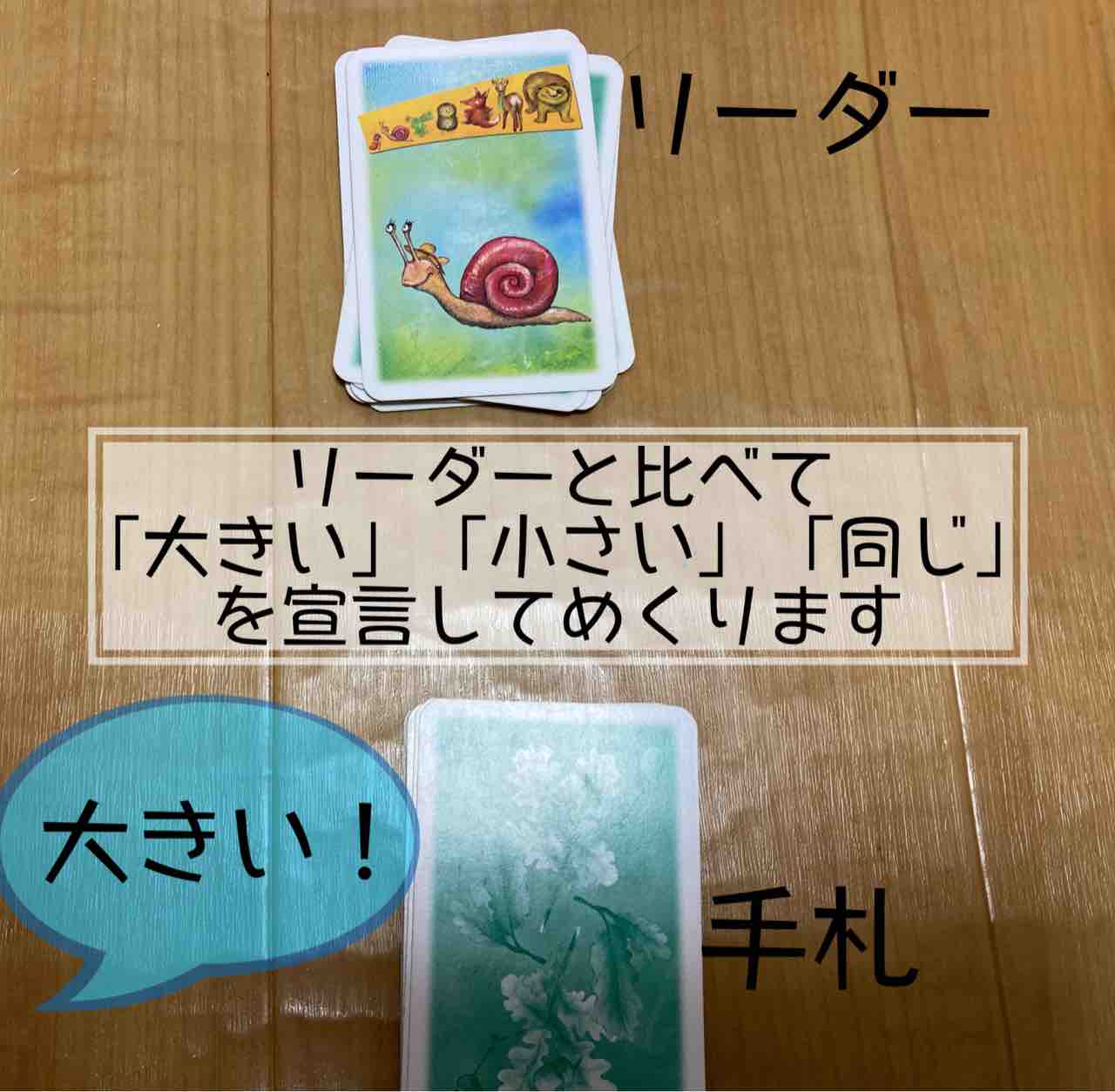 自分の山のいちばん上の動物が、 リーダ ーと比較して 「大きい」か「小さい」か「同じ」かを宣言します。