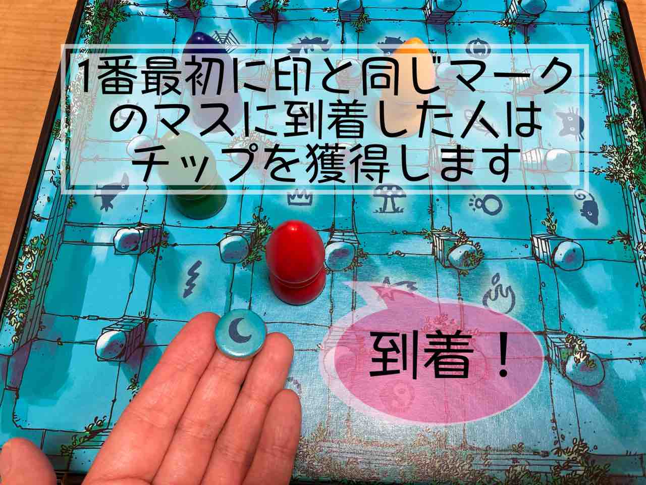 誰かがその印のマスにいる場合は、直ちにそのプレイヤーがチップを獲得し、新たなチップを引きます。
