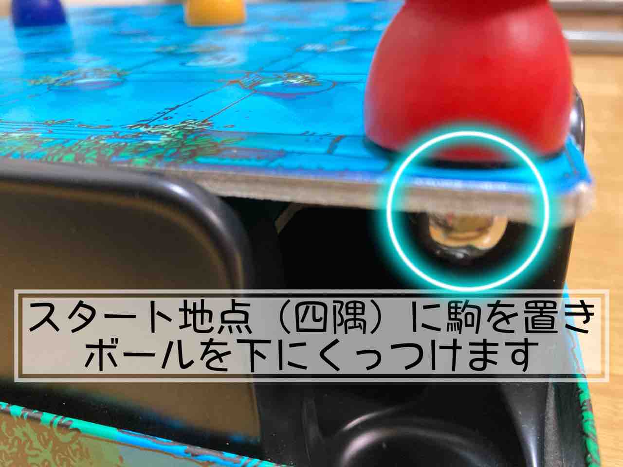魔法使いを角のスタートマスに置き、そのあど慎重にボールを磁石でくっつくようにフロアの下側につけます。