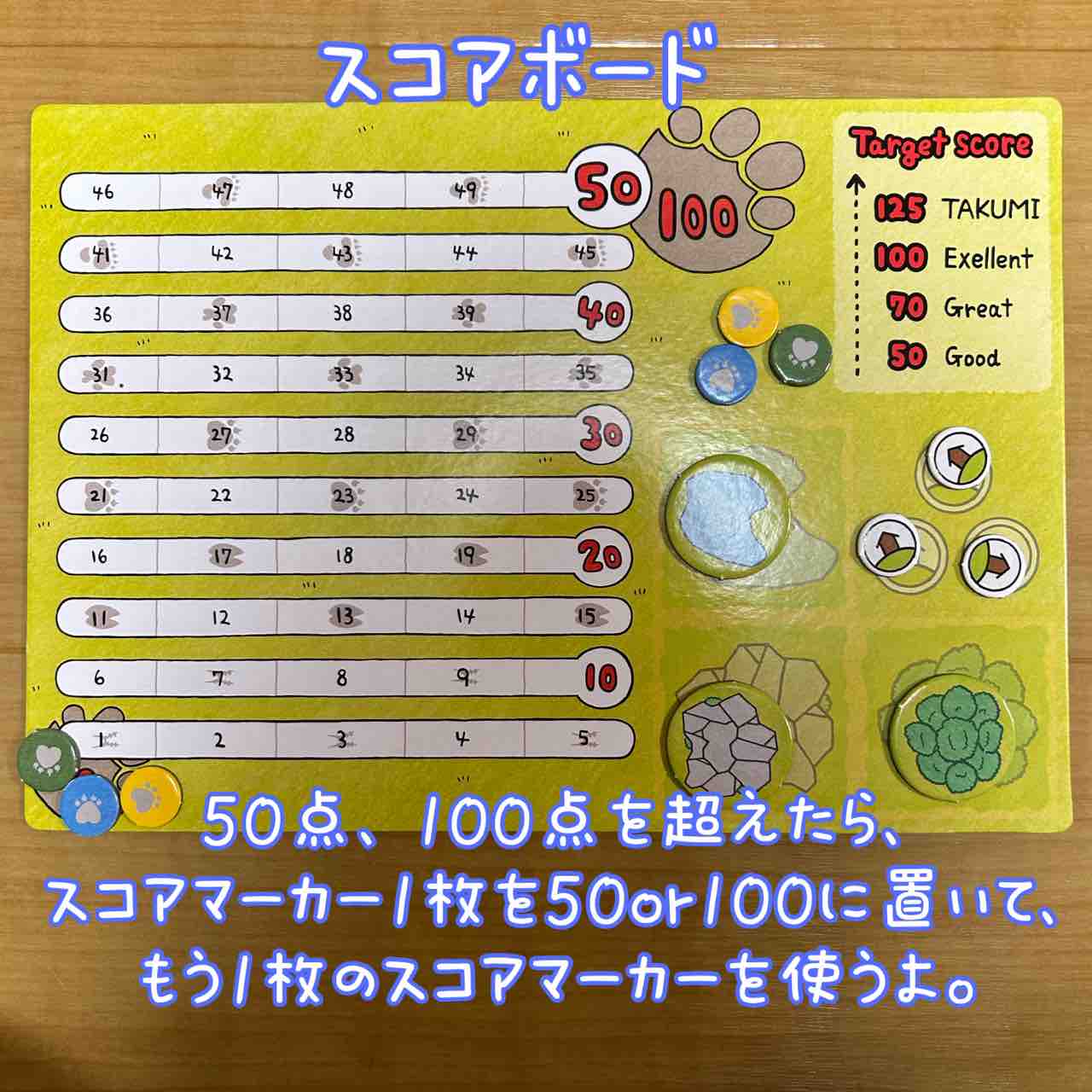 スコアボードの0点の位置にスコアマーカーを1個置きます。(50点を超えたら、もう一枚を使用します)
