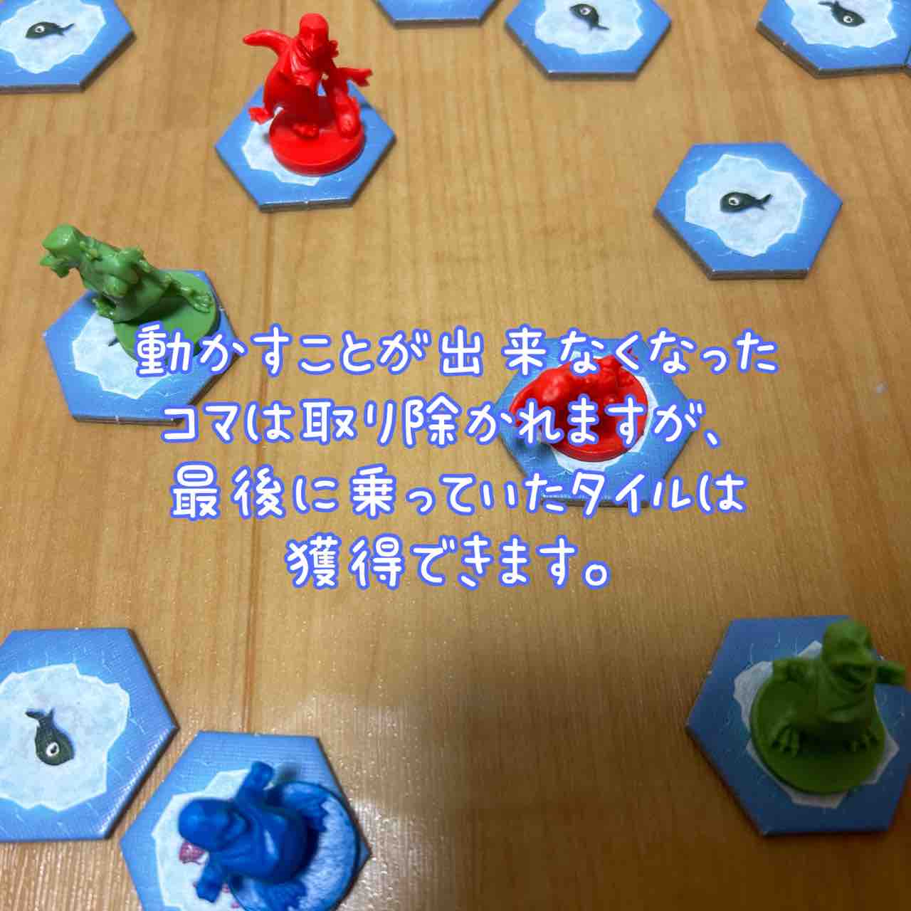 こうして抜けるプレイヤーは、自分のペンギンコマを全てタイルの上から取り除きますが、同時に、それらのコマが最後に乗っていた浮氷タイルも受け取ります。