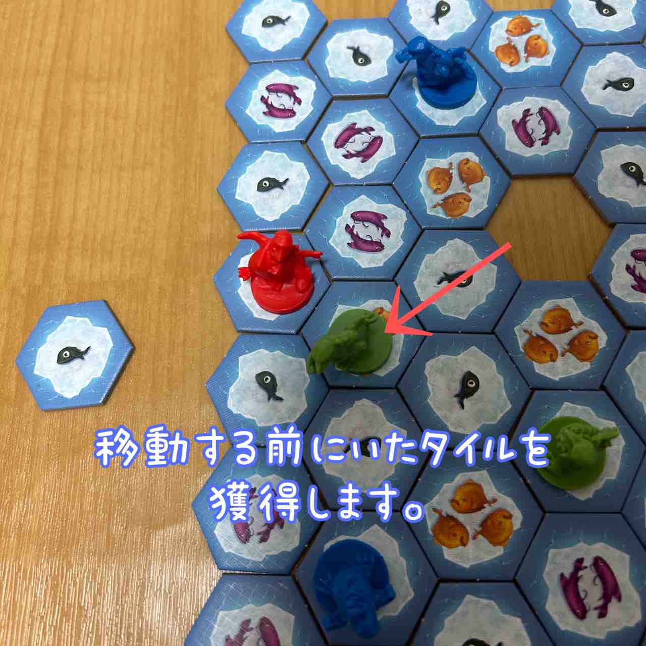 ステップ①で動かしたペンギンコマが「移動を始める前」に乗っていたタイルを受け取ります。このタイルに描かれた魚の数が獲得した魚の数となります。