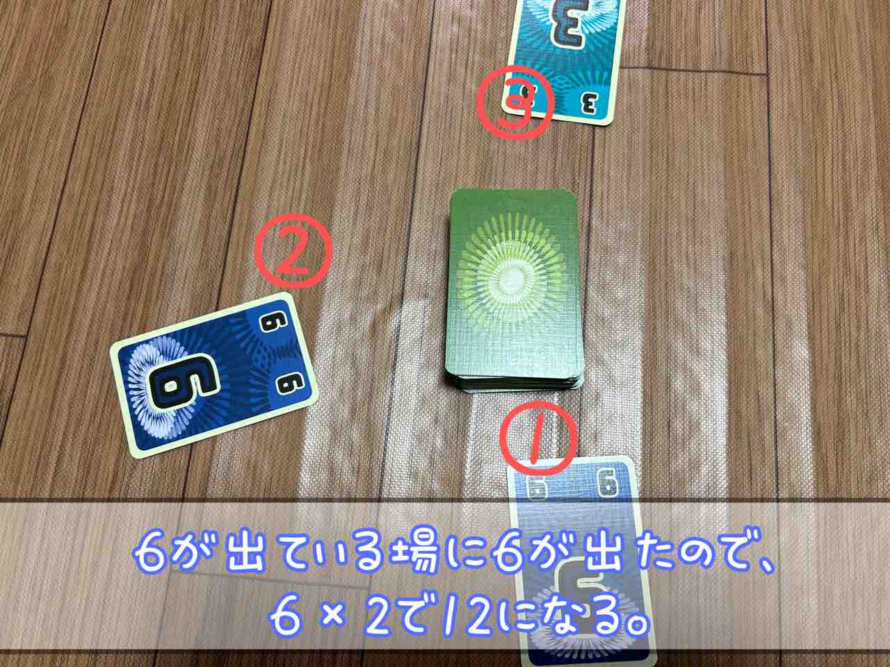 手番で出すカードが、ほかのプレイヤーが場に出している数と同じだった場合、そのカードの枚数倍の数字になります。例)