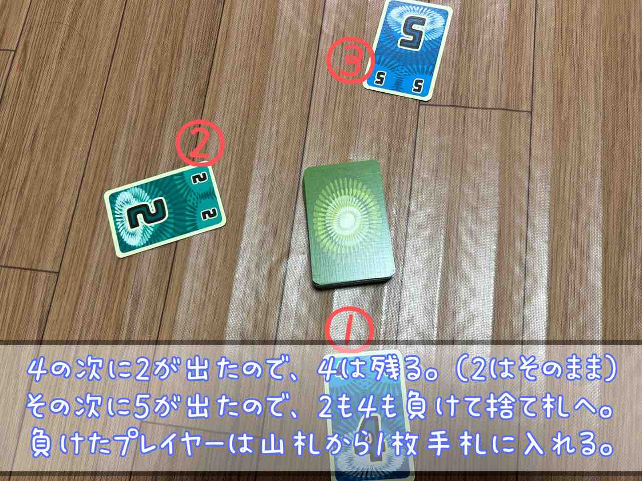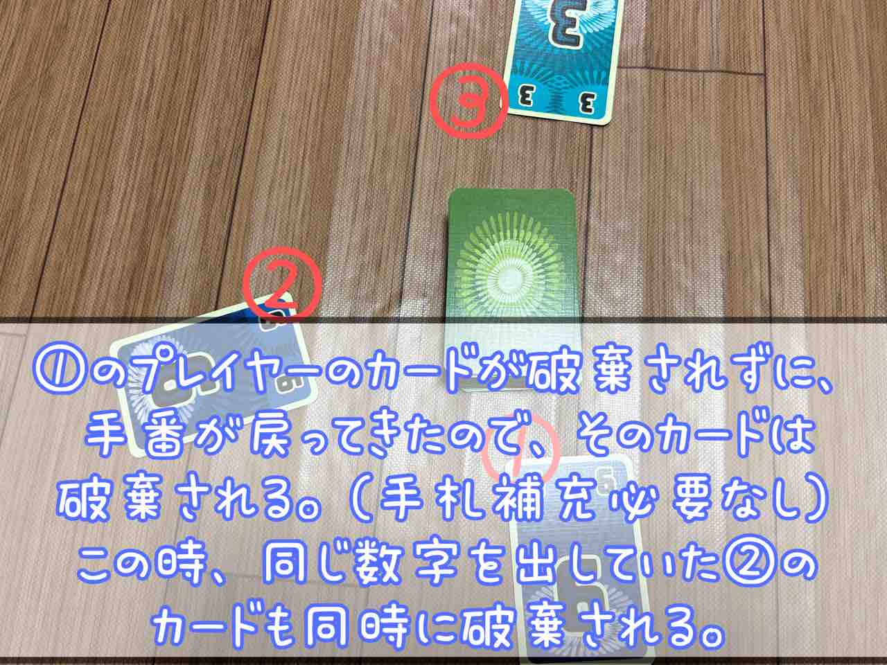 この時、この数字より小さい数字を自分の前に置いていたプレイヤーがいた場合は、そのプレイヤーの前にあるカードは捨て札となります。