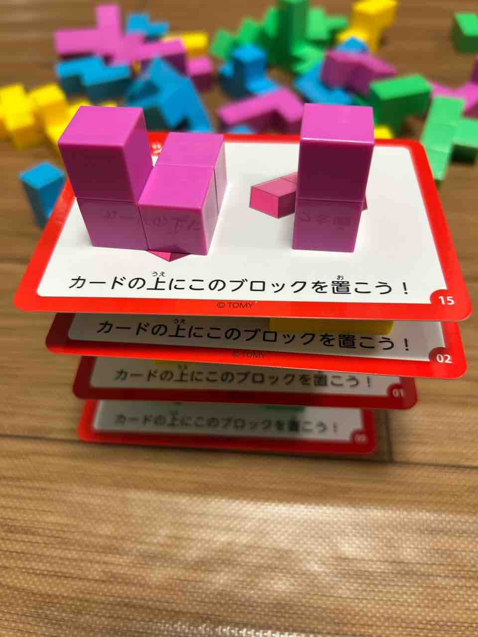 これまでのバランスゲームとの違いは、カードに置くブロックが指定されていて、カードとブロックを交互に置いていくこと。