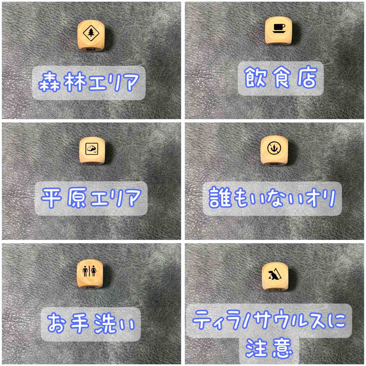 サイコロを振ったプレイヤーは選んだ恐竜コマを任意のオリに置くことができますが、それ以外のプレイヤーはサイコロの目によって決められたルールのオリに置かなければなりません。