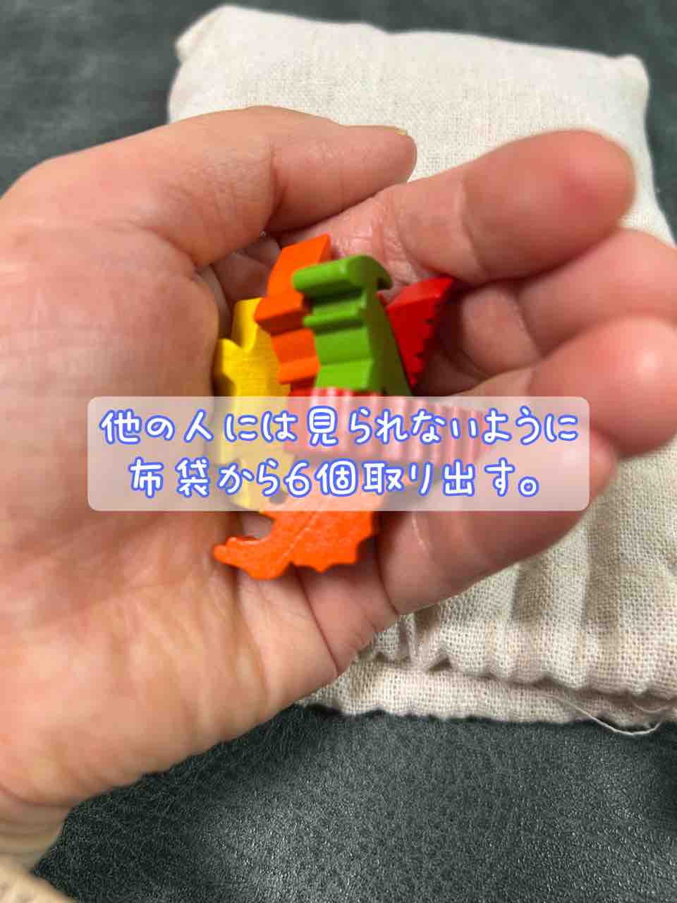各プレイヤーは、布袋の中を見ずに恐竜コマを6個ずつとり、他のプレイヤーに見えないように手の中に隠しておきます。